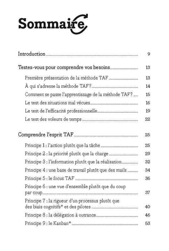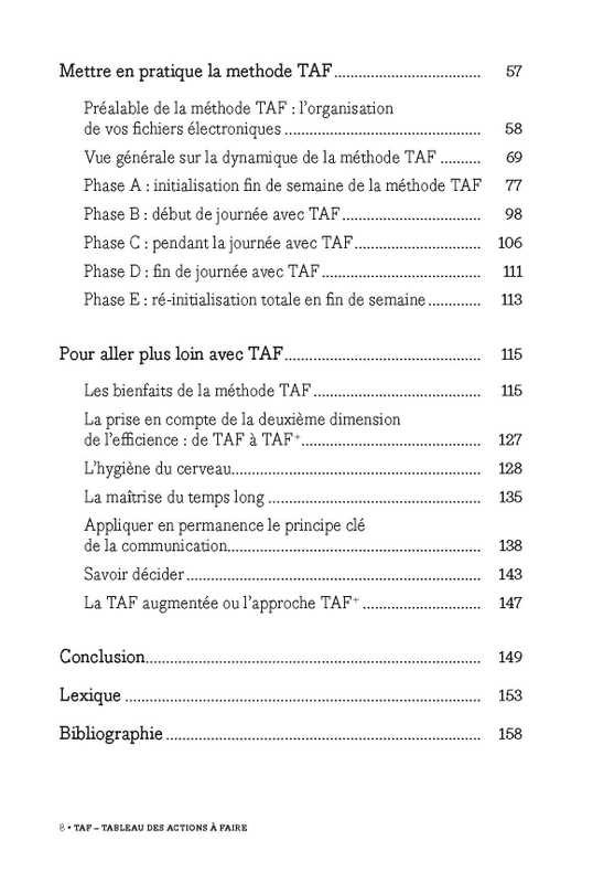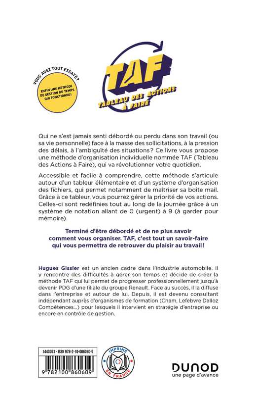 Qui ne s’est jamais senti débordé ou perdu dans son travail (ou sa vie personnelle) face à la masse des sollicitations, à la pression des délais, à l’ambiguïté des situations ? Ce livre vous propose une méthode d’organisation individuelle nommée TAF (Tableau des Actions à Faire), qui va révolutionner votre quotidien.