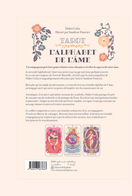 Le tarot de l’alphabet de l’ âme vous invite à un voyage intérieur profond à travers les 22 arcanes majeurs du Tarot de Marseille, revisités par la vision singulière de Didier Colin et magnifiquement redessinés par l’artiste Sandrine Fourrier. Bien plus qu’un simple jeu divinatoire, ce tarot devient un véritable alphabet de l’âme, un langage sacré qui ouvre 22 portes de lumière vers la connaissance de soi. Astrologue, écrivain et spécialiste reconnu des symboles, Didier Colin partage ici près de soixante ans de recherche et de pratique du Tarot. Il en livre une interprétation inédite et puissante : chaque arcane devient une lettre-nombre, un signe vivant qui transmet un message intime et universelà notre inconscient. Le coffret comprend 22 cartesaux tranches rehaussées d’or,accompagnées d’un livret illustré de 128 pages. Présenté dans un étui raffiné, il devient un véritable compagnon pour explorer pasà pas larichesse desarcanes, leur symbolisme et leur pouvoir de transformation.