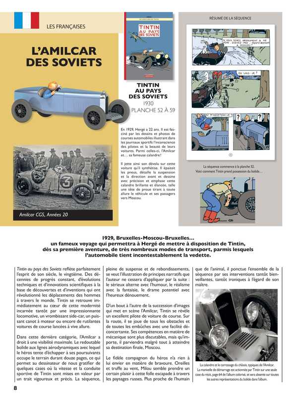 Chaque double page présente le modèle dans son contexte narratif, accompagné d’un document rare des archives d’Hergé, ainsi que du modèle réduit 1/24 de la collection Les voitures de Tintin coéditée par Moulinsart et Hachette Collections.