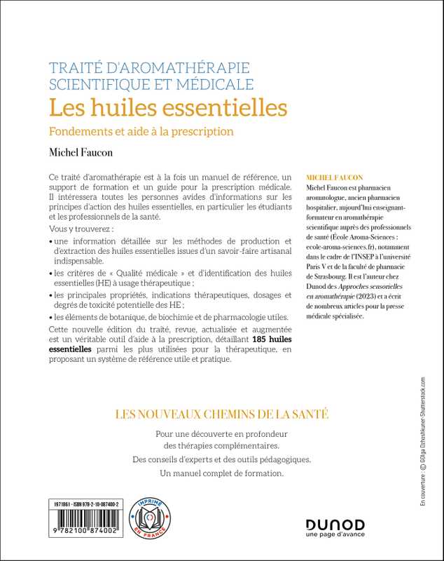 Ce traité d'aromathérapie est à la fois un manuel de référence, un support de formation et un guide pour la prescription médicale. Il intéressera toutes les personnes avides d'informations sur les principes d'action des huiles essentielles, en particulier les étudiants et les professionnels de la santé. Vous y trouverez : les principales propriétés et indications thérapeutiques ; les critères de qualité et d'identification des huiles essentielles (HE) à usage thérapeutique ; les éléments de botanique, de biochimie et de pharmacologie ; la production et l'extraction des huiles essentielles et des hydrolats aromatiques (HA), etc. Cet ouvrage est un véritable outil d'aide à la prescription, une monographie (HE, HV, HA) et propose un système de référence utile et pratique.