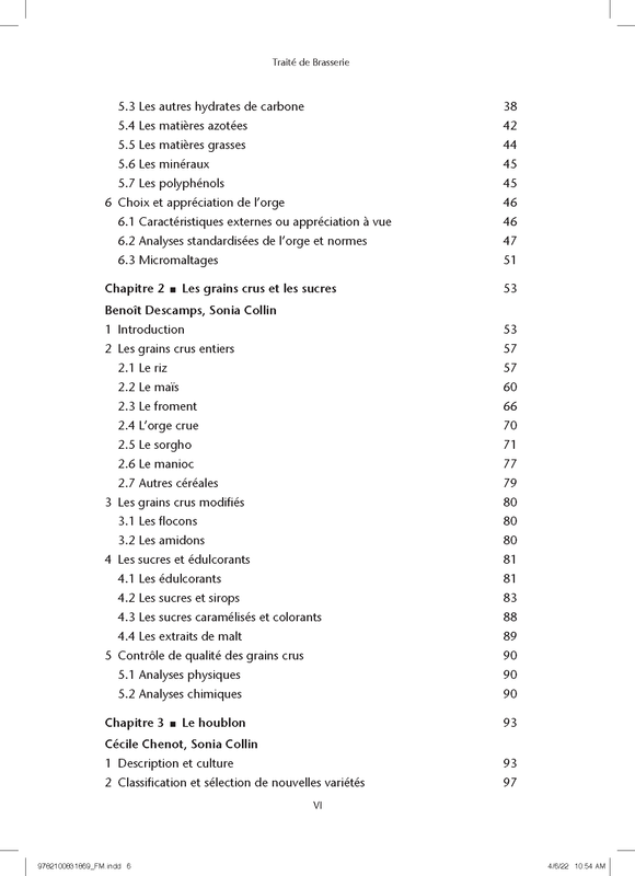 Ce premier tome, consacré à la bière et à ses matières premières, s’articule autour de trois grandes parties : matières premières (orge, grain cru et sucre, houblon, eau) ; maltage (préparation, trempage et germination de l’orge, touraillage, appréciation du malt et malt spéciaux) et bière finie (paysage brassicole mondial, principaux types de bière, qualités et défauts, débit de la bière).