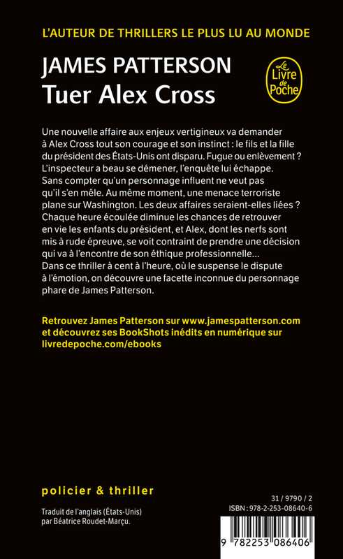 Une nouvelle affaire aux enjeux vertigineux va demander à Alex Cross tout son courage et son instinct : le fils et la fille du président des États-Unis ont disparu. Fugue ou enlèvement ? L'inspecteur a beau se démener, l'enquête lui échappe. Sans compter qu'un personnage influent ne veut pas qu'il s'en mêle. Au même moment, une menace terroriste plane sur Washington. Les deux affaires seraient-elles liées ? Chaque heure écoulée diminue les chances de retrouver en vie les enfants du président, et Alex, dont les nerfs sont mis à rude épreuve, se voit contraint de prendre une décision qui va à rencontre de son éthique professionnelle...