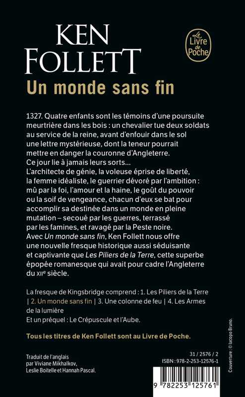 1327. Quatre enfants sont les témoins d’une poursuite meurtrière dans les bois : un chevalier tue deux soldats au service de la reine, avant d’enfouir dans le sol une lettre mystérieuse, dont la teneur pourrait mettre en danger la couronne d’Angleterre. Ce jour lie à jamais leurs sorts... L’architecte de génie, la voleuse éprise de liberté, la femme idéaliste, le guerrier dévoré par l’ambition : mû par la foi, l’amour et la haine, le goût du pouvoir ou la soif de vengeance, chacun d’eux se bat pour accomplir sa destinée dans un monde en pleine mutation – secoué par les guerres, terrassé par les famines, et ravagé par la Peste noire. Avec Un monde sans fin, Ken Follett nous offre une nouvelle fresque historique aussi séduisante et captivante que Les Piliers de la Terre, cette superbe épopée romanesque qui avait pour cadre l’Angleterre du xiie siècle.