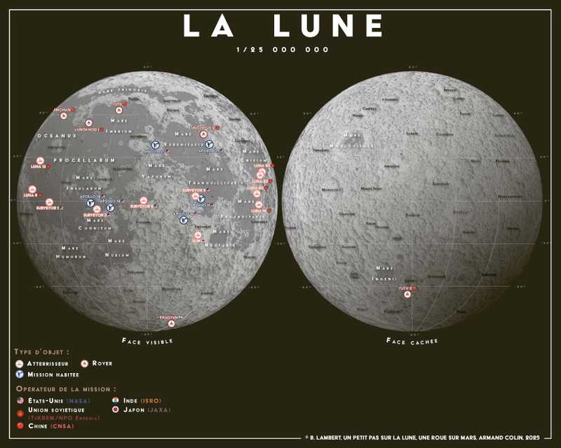 Finement réalisées à partir des données les plus récentes de la NASA et de l’Union internationale d’astronomie, les cartes de ce recueil proposent une immersion inédite dans les paysages lunaires et martiens, deux astres au cœur des stratégies spatiales actuelles liées à la nouvelle course à l’espace.