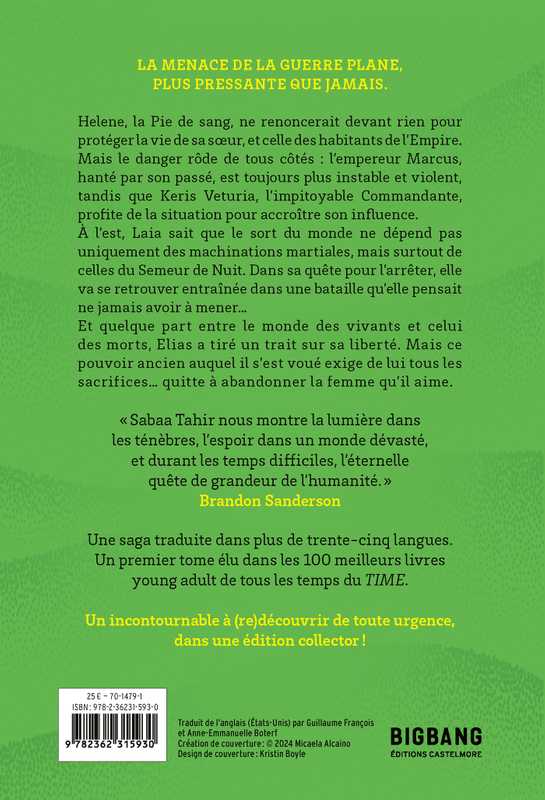 « Sabaa Tahir nous montre la lumière dans les ténèbres, l'espoir dans un monde dévasté, et durant les temps difficiles, l'éternelle quête de grandeur de l'humanité. » Brandon Sanderson