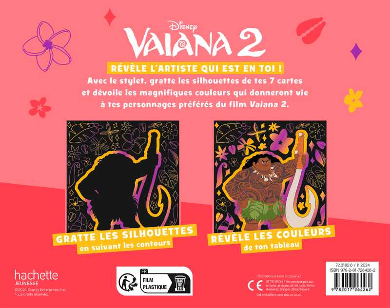 À l’aide du stylet, l’enfant gratte les silhouettes de ses personnages de Vaiana 2 préférés pour révéler leurs couleurs. Puis il peut enrichir son tableau en grattant tous les motifs afin de laisser apparaître de magnifiques couleurs arc-en-ciel !