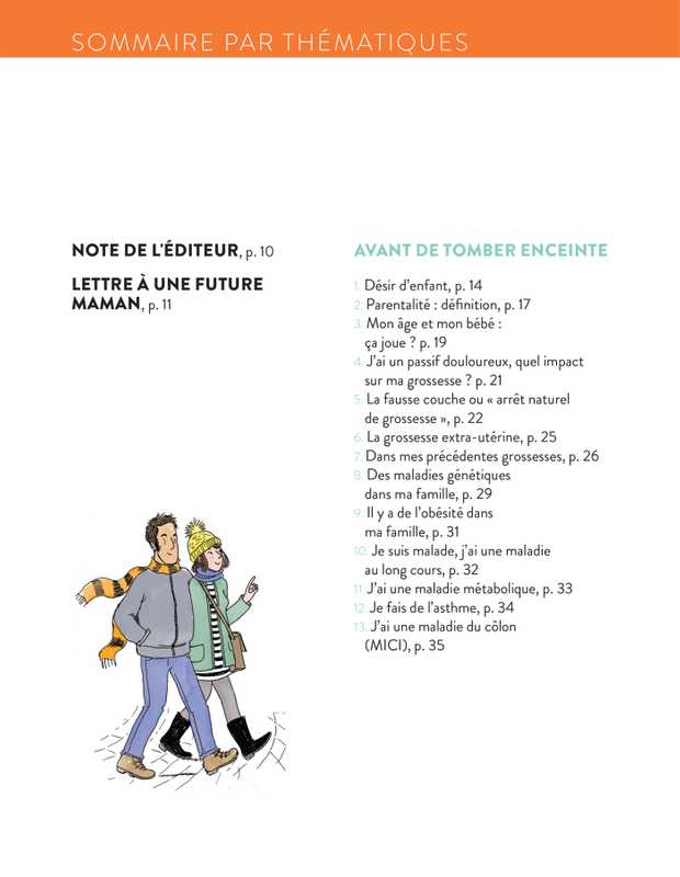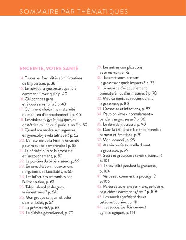 - Toutes les étapes de la grossesse pour vous et pour votre bébé décryptées : Avant de tomber enceinte ; Enceinte votre santé ; Votre bébé pendant la grossesse ; L’accouchement ; Votre bébé à sa naissance ; Le post-partum.