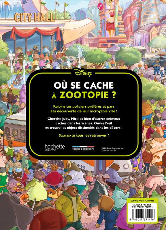 - Des illustrations qui fourmillent de détails pour s’amuser à retrouver Judy, Nick et les autres personnages de Zootopie, mais aussi de nombreux éléments cachés dans les décors !